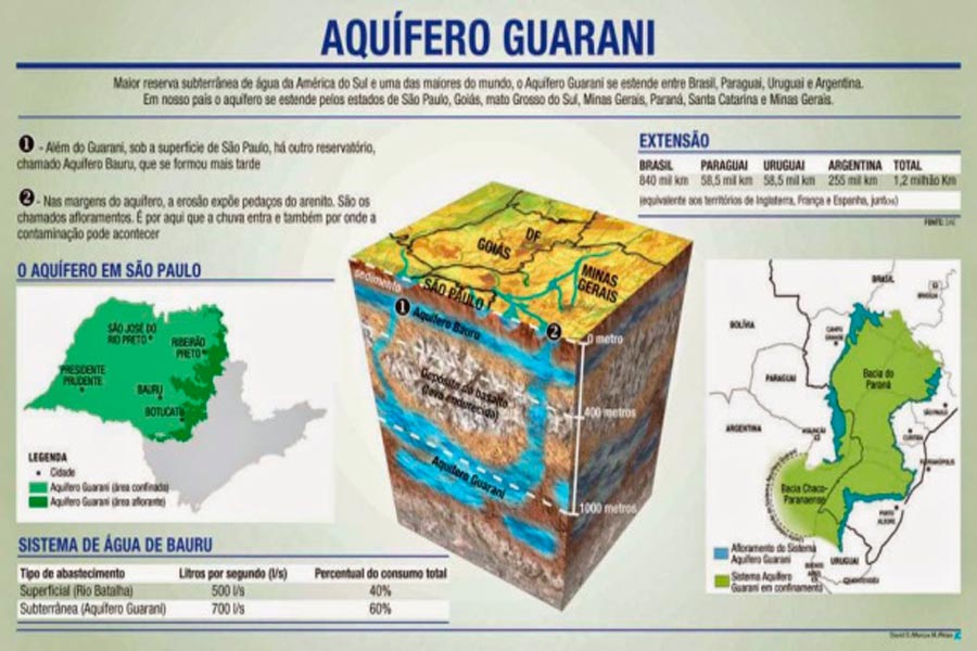 Con cerca de 132 millones de años, su extensión tiene las conocidas dimensiones del continente americano: 1 190 000 kilómetros cuadrados, superficie más grande que la de los territorios de España, Francia y Portugal. Es conocido como el Gigante del MERCOSUR al extenderse, como reservorio de agua pura, desde el norte de Brasil, ocupar parte de Paraguay y Uruguay y finalizar en la pampa argentina. Algunos especialistas opinan que, a enormes profundidades, se haya conectado con los lagos de la Patagonia. Su volumen explotable en la actualidad es de 40 a 80 kilómetros cúbicos, una cifra equivalente a cuatro veces la demanda total anual de la Argentina.