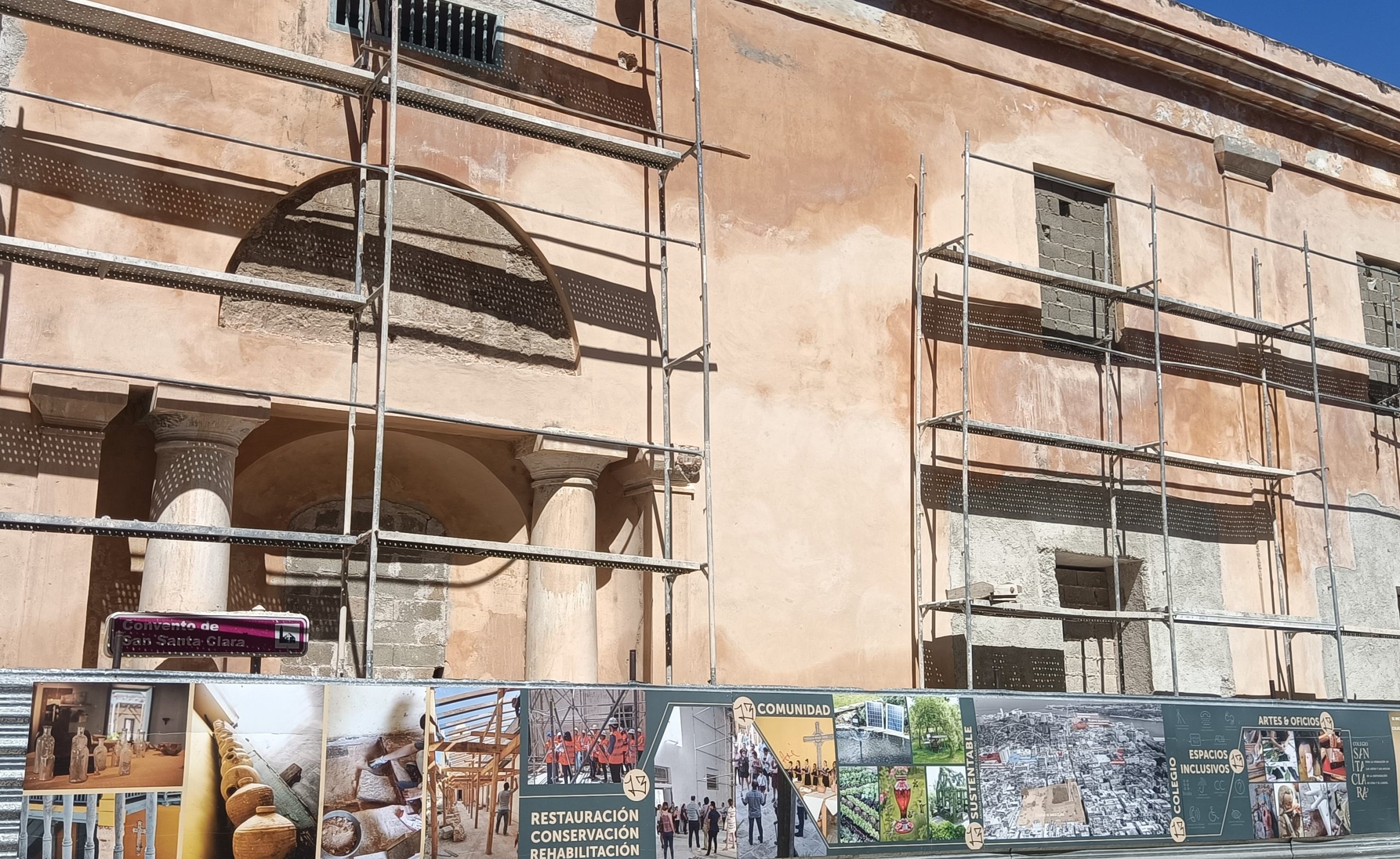 Especialistas indican que, desde el exterior, los claustros del antiguo Convento de Santa Clara se aprecian como un edificio único, debido a la homogeneidad del conjunto.