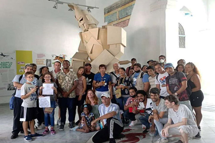 Grupo cubano seguidor de Voltus V junto a la obra Proyecto Honor, del artista visual Wilber Aguilera, emplazada en el lobby de la Vitrina de Valonia.