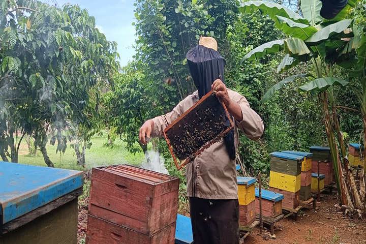 “La época de mejor cosecha es de diciembre, con el inicio de la floración de la campanilla blanca, a marzo. En Santa Amelia también hay mango, romerillo, café y algún cítrico, por lo que se obtiene una miel polifloral, con un rendimiento de unos 40 kilogramos por colmena”, dice el apicultor.