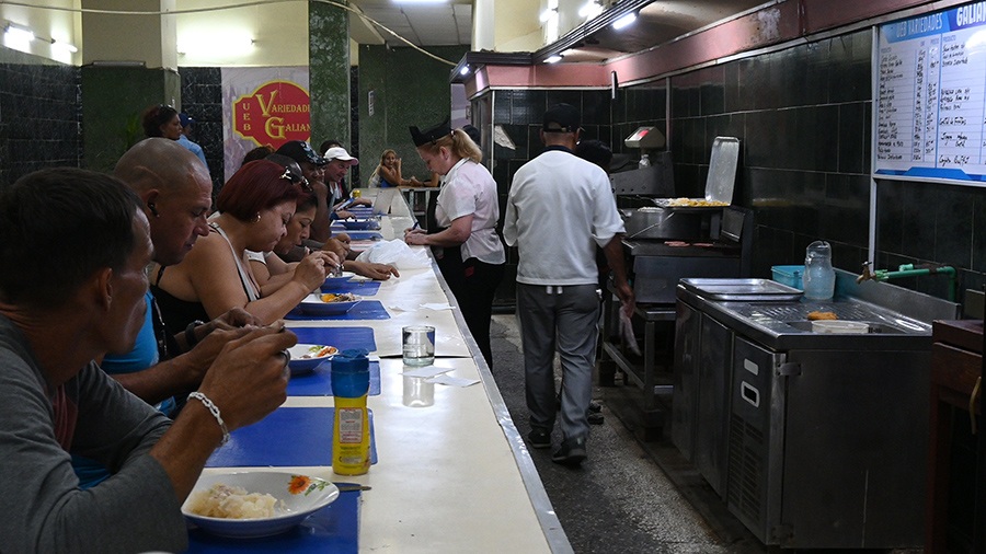 La Economía Social y Solidaria requiere encadenamientos productivos y alianzas entre actores económicos, además de revalorizar el aporte social del sector estatal (empresarial y presupuestado). Clientes ingieren alimentos en el interior de un establecimiento estatal que comercializa sus productos en moneda nacional, en La Habana. Foto: Jorge Luis Baños/IPS