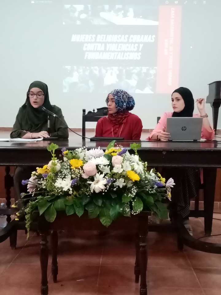 Ania Herrera de la Comunidad Católica de Sant Egidio, Lissett Albalah de la comunidad judía y Gisela Calderón de la Liga Islámica de Cuba, conversan sobre los conceptos de paz y responsabilidad ambiental de las mujeres dentro de sus comunidades de fe e introdujeron los principios de la violencia de género.