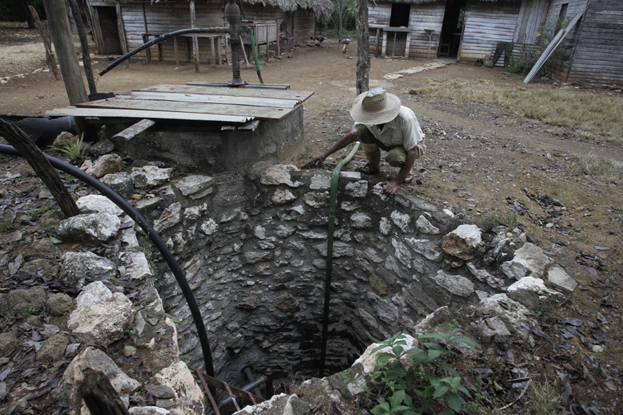Un campesino observa el nivel de agua del pozo que tiene en el patio de su casa, en el municipio Horno de Guisa, en la provincia de Granma, en el este de Cuba.