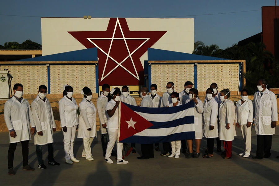 Integrantes de la Brigada Médica cubana Henry Rieeves , especializada desastres y epidemias, durante la ceremonia de abanderamiento en La Habana, antes de partir el 27 de abril a una misión a Santo Tomé y Príncipe, para colaborar con ese país insular africano en la respuesta a la covid-19.