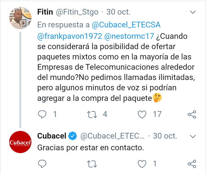 Fueron estas algunas de las interrogantes más frecuentes en un foro vía Twitter que realizó la división de servicios móviles de la estatal empresa de telecomunicaciones de Cuba (Etecsa), Cubacel. La compañía, en su cuenta oficial de más de 15.600 seguidores, pidió comentarios, dudas y sugerencias sobre los servicios que brinda; y les llovieron cientos.