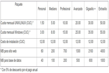 Hasta el momento las tarifas mensuales publicadas en el sitio oficial www.etecsa.cu, con un descuento del cinco por ciento por el pago anual del servicio, oscilan entre los 1,70 dólares hasta 56, en el caso de Unix/Linux; y de 3,40 dólares hasta 62 para Windows.