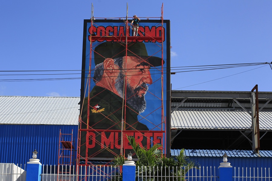Un trabajador labora en la restauración de un cartel gigante que muestra el rostro del líder de la Revolución Cubana, Fidel Castro, en áreas de la Empresa Mecánica de transformado del Acero, en La Habana.