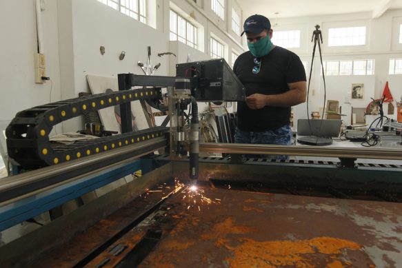 El ingeniero e innovador Enmanuel Carmona junto a una máquina para realizar cortes por plasma en planchas de acero que ha desarrollado junto integrantes del movimiento maker cubano, en la galería taller La Lavandería, sito en el capitalino municipio Playa.