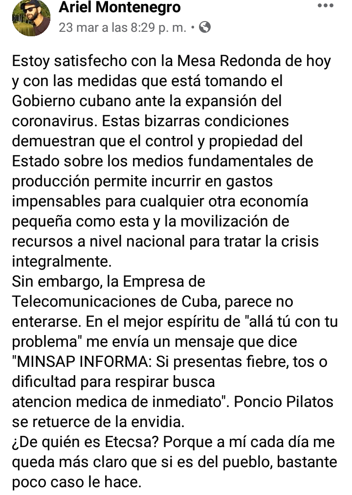 Por su parte, el periodista Ariel Montenegro confiesa sentirse satisfecho con las medidas aplicadas por el país, “sin embargo, Etecsa parece no entererarse”.
