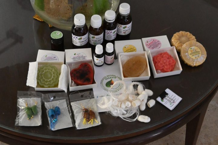 En el encuentro-taller se exhibieron varios productos, de Sedavid, elaborados a partir de la seda: jabones artesanales de verbena y lavanda y cremas para después de afeitar de menta, lavanda y tabaco, entre otros. Desde 2022, en alianza con instituciones y emprendimientos, Eco Rizos organiza este Encuentro que, en octubre de 2024, tuvo su tercera edición. (Foto: Jorge Luis Baños/IPS Cuba)
